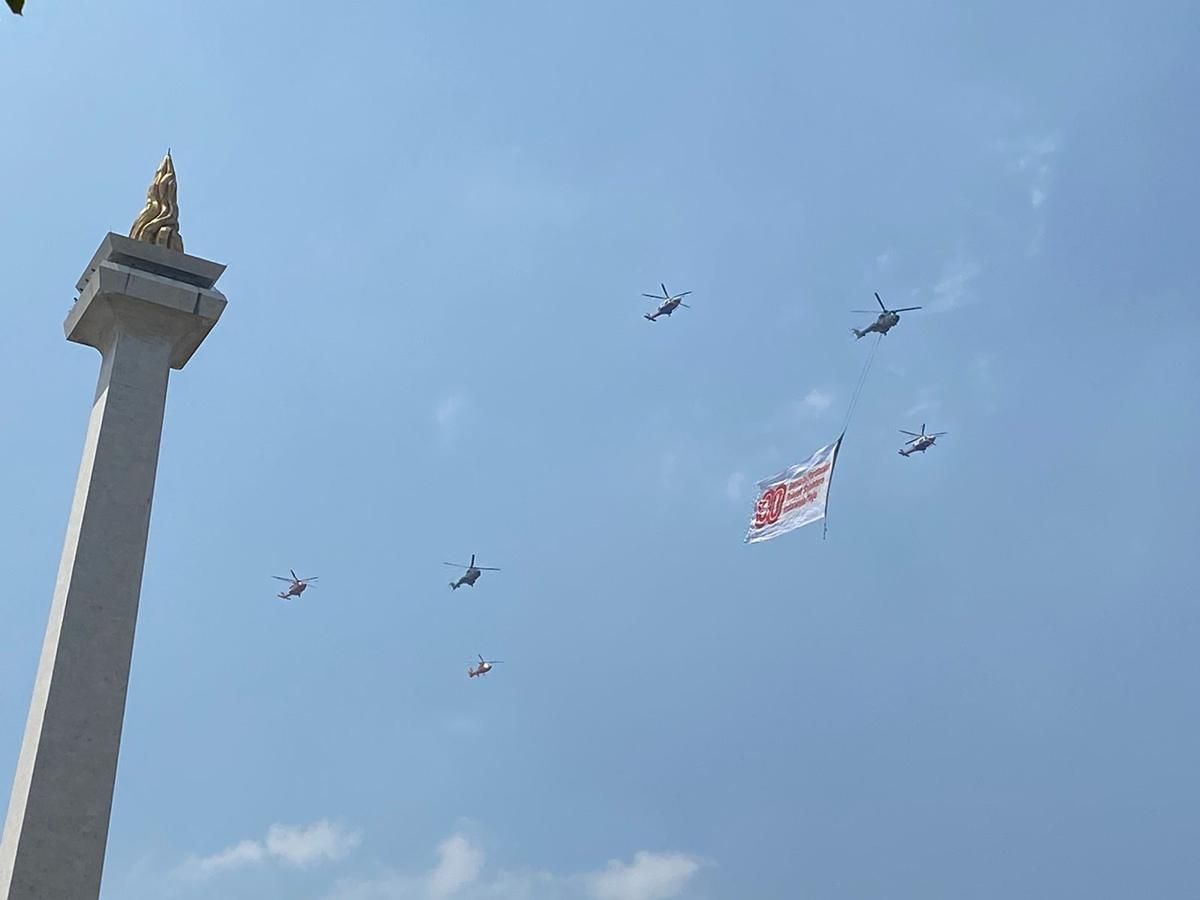 1. Pesawat helikopter Heli Carcal, Heli Super Puma, Heli Apache, Heli Phanter, Heli AW-169, dan Heli Dauphin tampil dalam pertunjukan di langit Istana dan Monas.