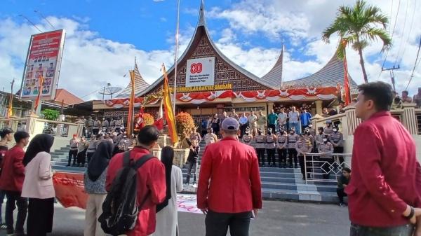 Puluhan mahasiswa dari Badan Eksekutif Mahasiswa (BEM) Universitas Muhammadiyah Sumatera Barat (UM Sumbar) bersama Ikatan Mahasiswa Muhammadiyah (IMM) Cabang Bukittinggi menggelar aksi damai di depan gedung DPRD Kota Bukittinggi, Minggu (31/8/2025).