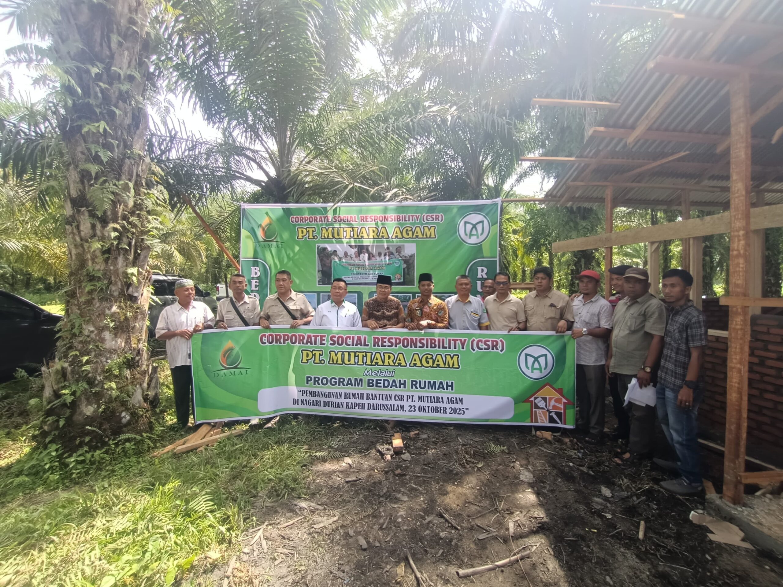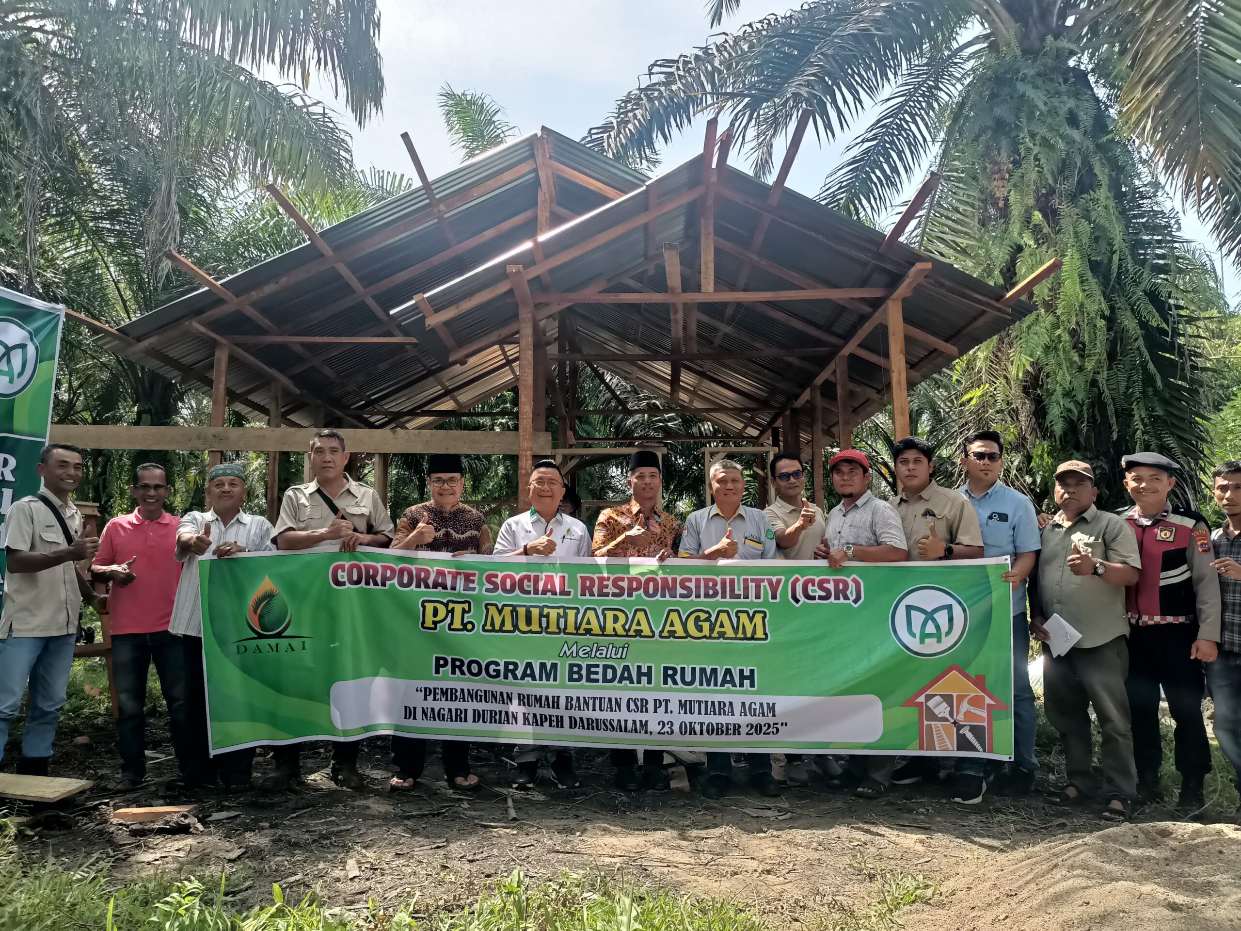 Kab. Agam, Lintastiga – Pihak Managemen PT. Mutiara Agam DAMAI Group kembali mengubah tangis warga menjadi senyuman dengan menyalurkan bantuan bedah rumah menggunakan dana Corporate Social Responsibility (CSR) Perusahaan tersebut Kamis, 23 Oktober 2025 di Nagari Durian Kapeh Darussalam, Kecamatan Tanjung Mutiara, Kabupaten Agam, Sumatera Barat.